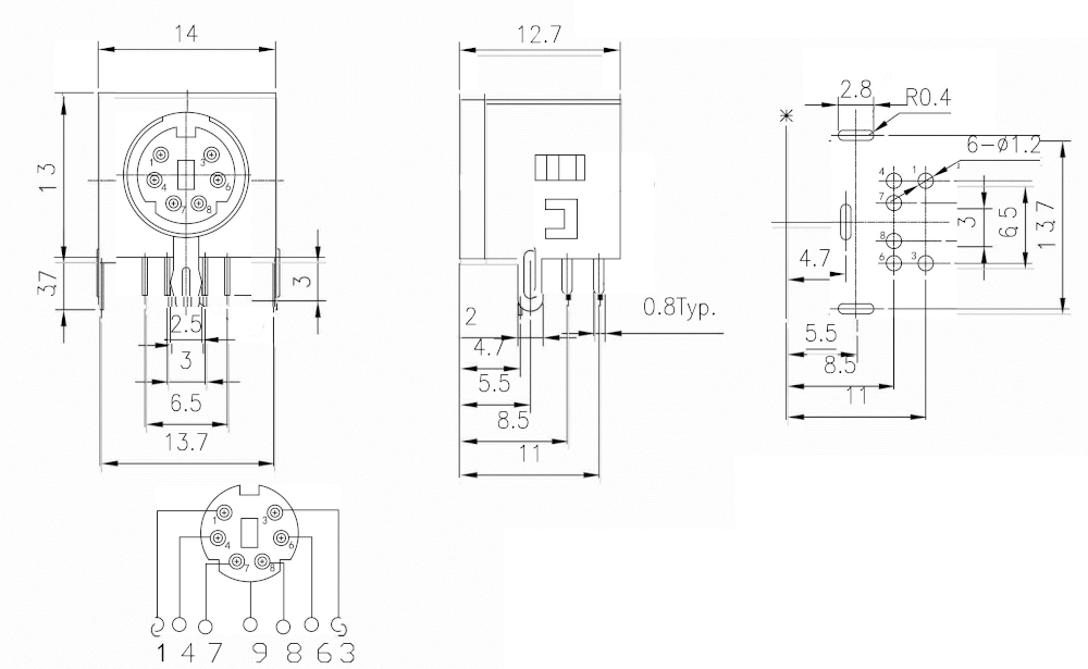MDN-6FR Гнездо mini DIN 6 контактов на плату